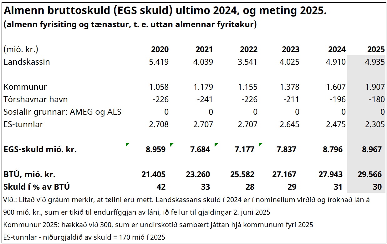 Talvan omanfyri vísir, at EGS-skuldin hjá Føroyum er um 30% av BTÚ við ársenda 2025.