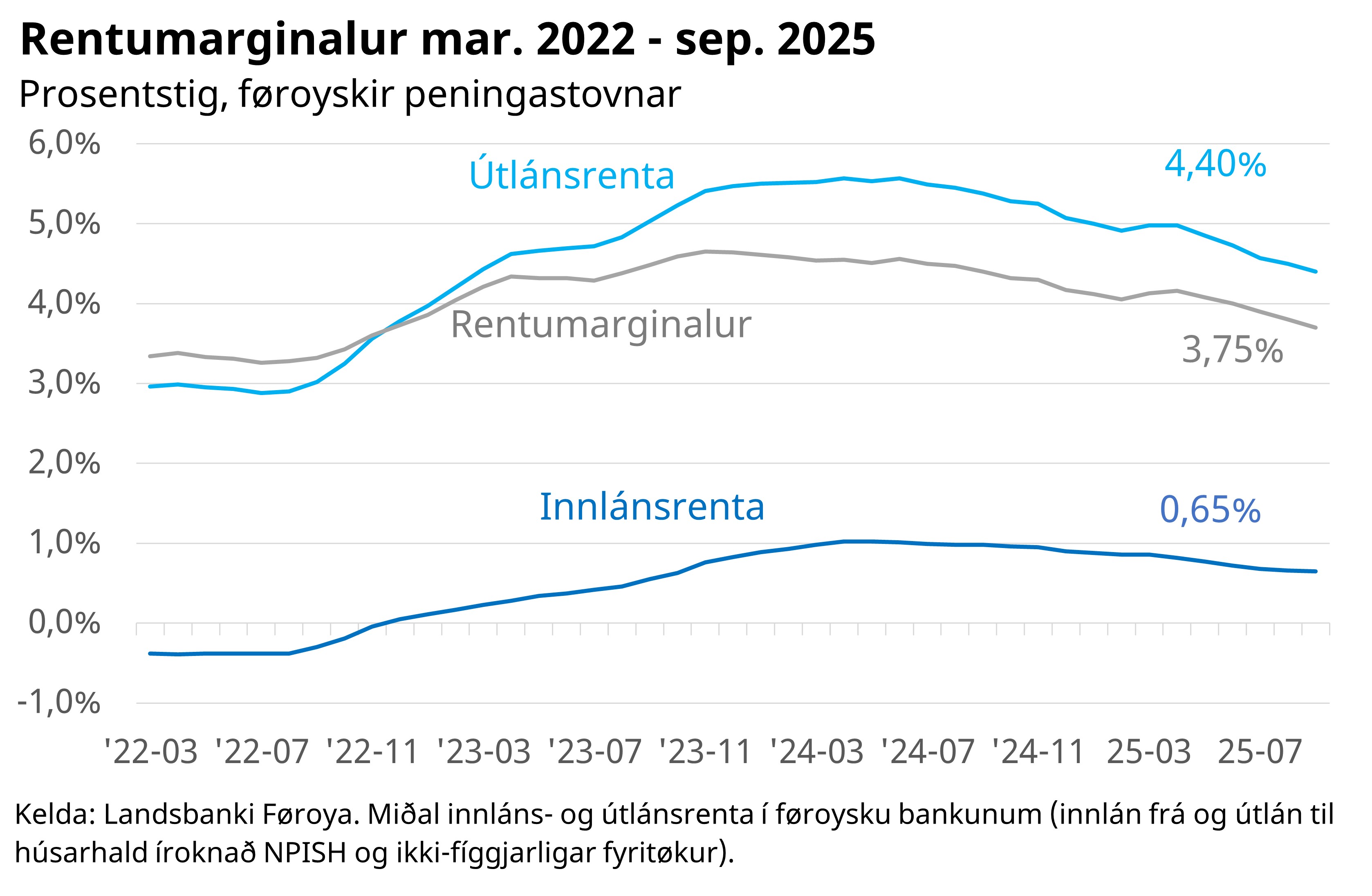 Miðal útlánsrentan hjá føroysku privat- og vinnukundunum í føroysku bankunum var 4,40% í september 2025, ímeðan miðal innlánsrentan var 0,65%. Rentumarginalurin er munurin millum innláns- og útlánsrentuna og hann var tí 3,75%.