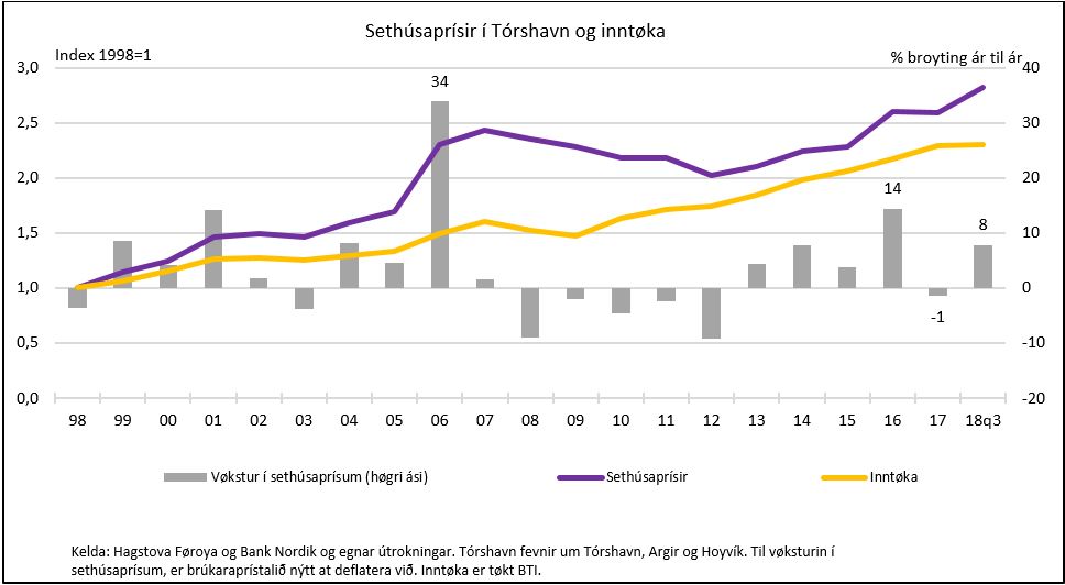 Undan fíggjarkreppuna vuksu sethúsaprísirnir munandi skjótari, enn inntøkurnar. Í 2006 øktust sethúsaprísirnir við heili 34 prosentum í Havn í mun til árið fyri, meðan tøka inntøkan sama tíðarskeið vaks 12 prosent. Árið eftir hæsaði vøksturin í sethúsaprísunum av, men í 2016 tók hann aftur dik á seg. Sethúsaprísirnir eru tó ikki hækkaðir eins skjótt hesi seinastu árini, sum undan fíggjarkreppuni.